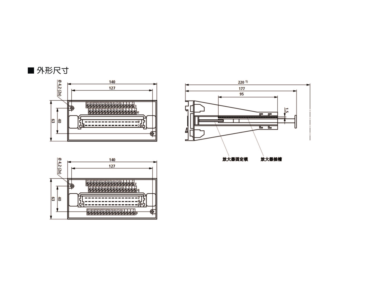 ● 支架底部兩側安裝有 IEC603/DIN41612母型接線端